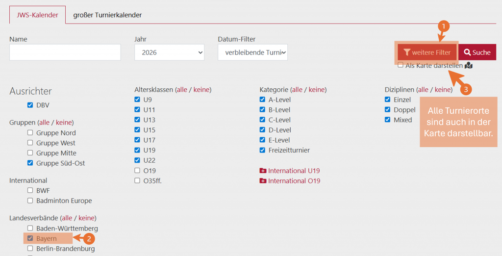 Unter "Weitere Filter" kannst Du ganz einfach nach den passenden Turnieren filtern, die für Dich relevant sind. Auch kannst Du Dir die Turniere mit den Ausrichtungsorten in einer Karte darstellen lasen, um schnell einen Überblick zu erhalten. Turniere mit dem Level A haben das höchste Spielniveau, Turniere mit Level E das Niedrigste.